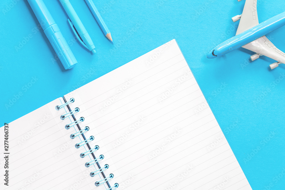 Blue toy airplane with a notepad and pencils on light blue background border. Flat lay with copy space for air travel planning or ticket fare and visa or booking concept