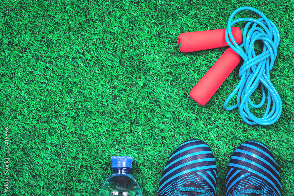Skipping rope, trainers and water bottle against green artificial turf, top view with copy space, fitness and excercise concept