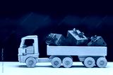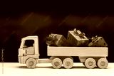Truck with gifts in red boxes. Wooden toy car. Red background, copy space, holiday concept.