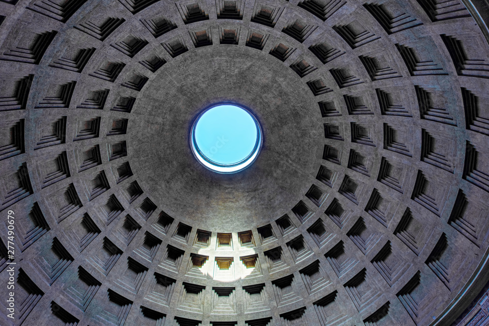 Pantheon dome indoors: Ray of sunlight passing through an oculus in the ceiling - Rome, Italy.