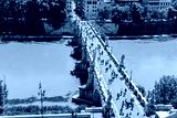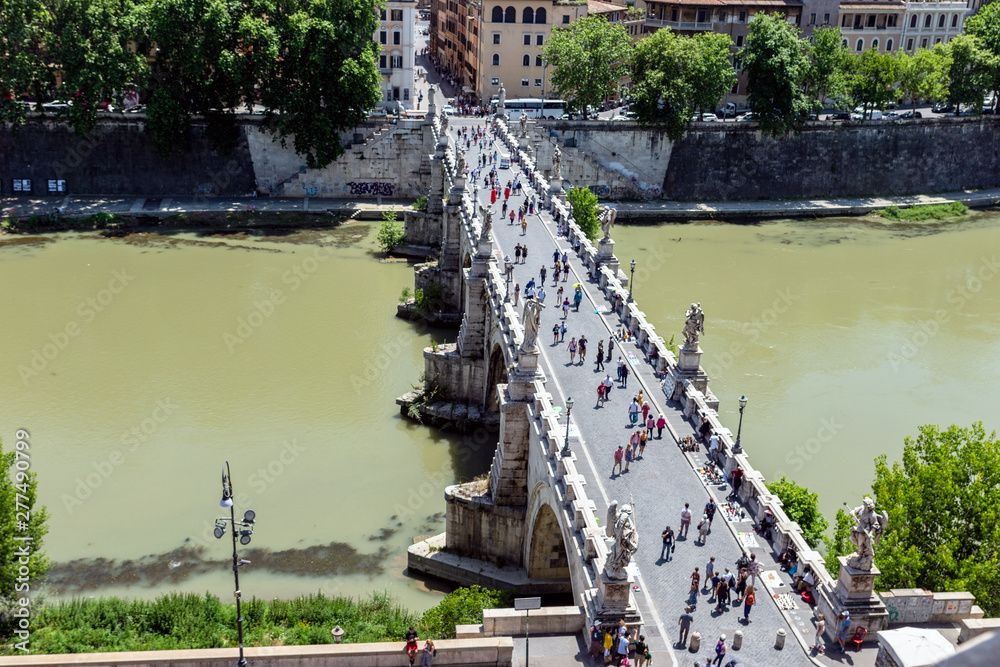 Pedestrian walking on the Sant'Angelo bridge in Rome, Italy. Top view from Castel Sant'Angelo.