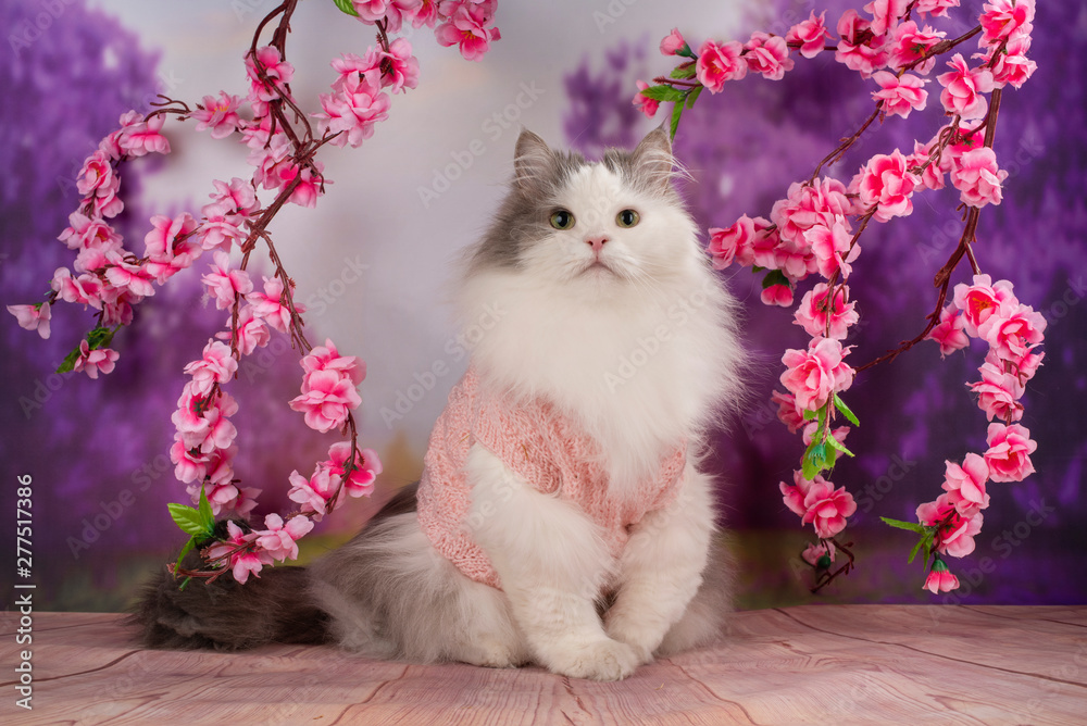 cat in a pink knitted sweater with blooming trees