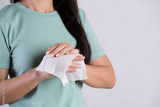 Woman cleaning her hands with a tissue. Healthcare and medical concept.