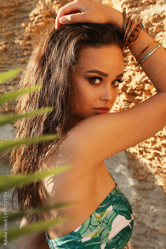 beautiful woman with dark hair in elegant swimming suit relaxing at the summer beach