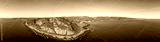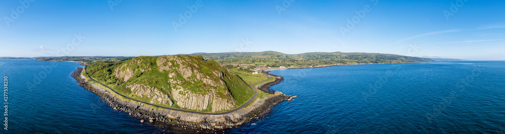 Northern Ireland, UK. Wide aerial panorama of Ballygalley Head mountain and Causeway Coastal Route a.k.a Antrim Coast Road between Larne and Ballygalley. One of the most scenic coastal roads in Europe