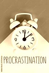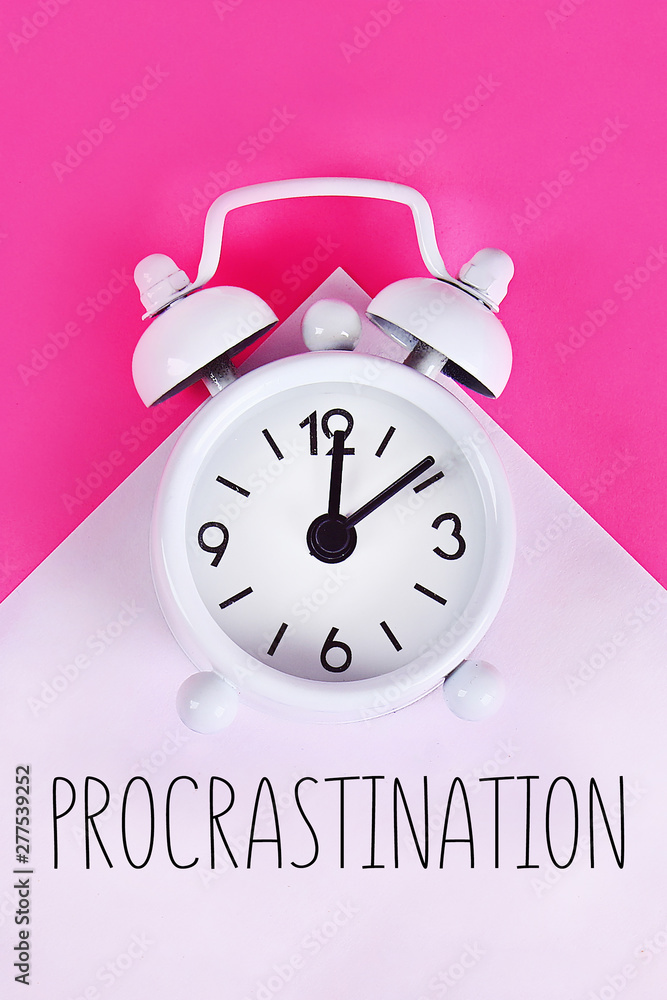 Procrastination, delay, urgency concept. White alarm clock with text procrastination.