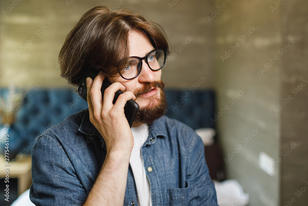 Bearded hipster man wearing glasses speaking on the smartphone at the bedroom