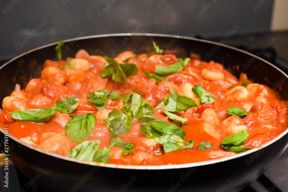 Home made Italian pasta dish with rich sauce cooking in a pan