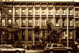 Scenic view of a classic Brooklyn brownstone block with a long facade and ornate stoop balustrades on a summer day in Clinton Hills, Brooklyn