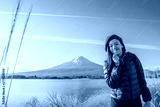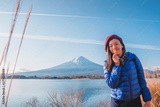 Asian beautiful smiling woman tourists are traveling and feel happy in the Field of dry grass with Mt Fuji in the morning on the lake kawaguchiko, Japan.On autumn season background.
