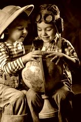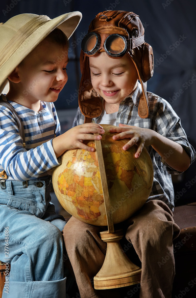 Two boys, imagining themselves a traveler and a pilot, play in his room