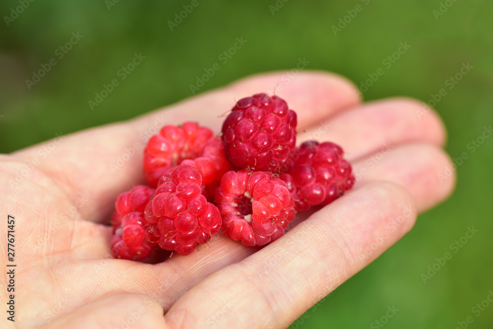 rote frische Himbeeren auf der Hand einer Person werden angeboten