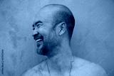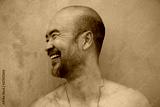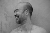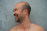 laughing profile of 30-40s beard bald Japanese topless happy cool man portrait on grey concrete wall background