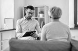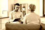 geriatric psychology, mental therapy and old age concept - senior woman patient and psychologist with clipboard taking notes at psychotherapy session