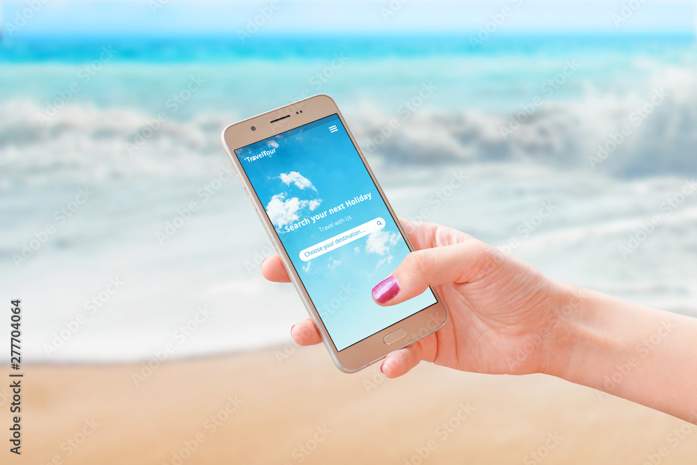 Woman use travel app on smart phone to find next travel destination. Beach and sea in background. Close-up.