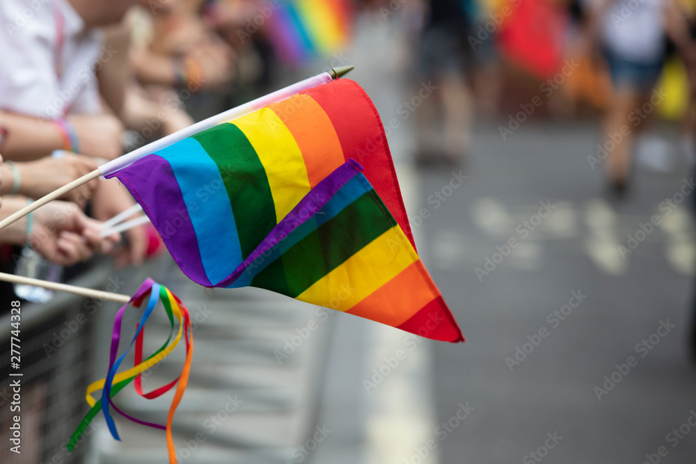 Spectators waves a gay rainbow flag at an LGBT gay pride community event