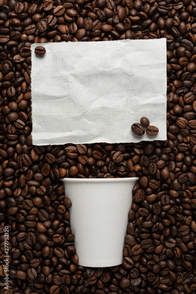 White cup of coffee on the background of roasted beans with a place for text menu or recipe.