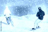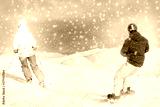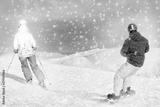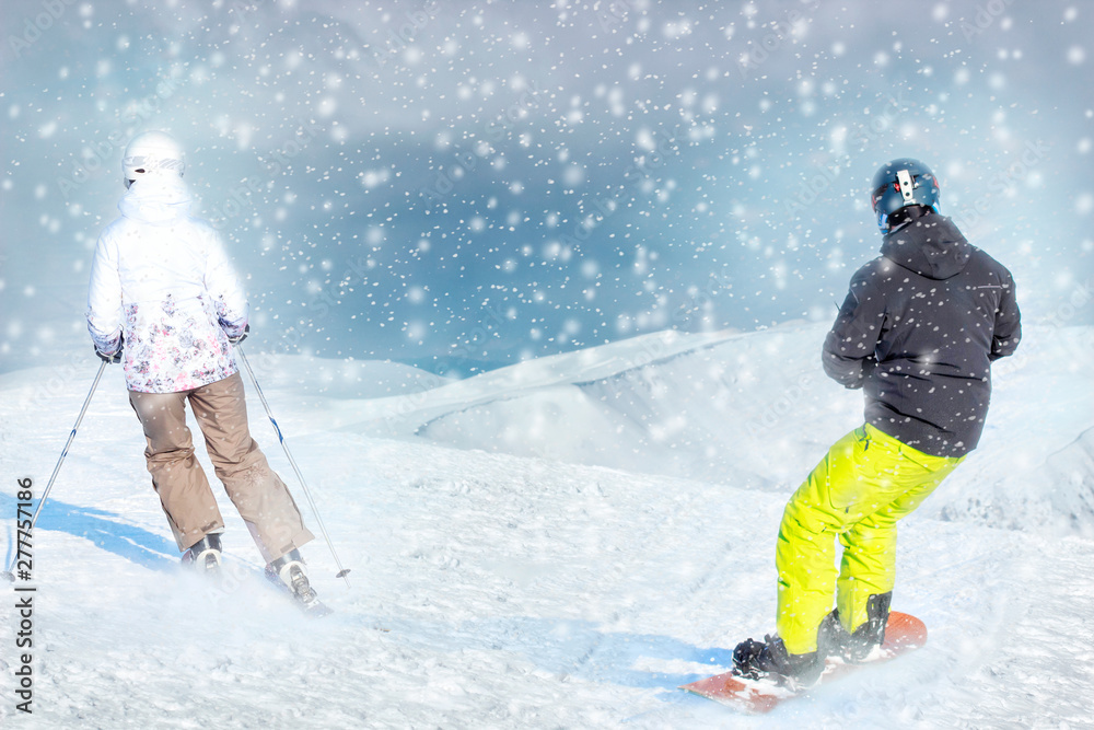Two active friends skier and snowboarder ride on mountain top against blue snow sky and mountains. Ski resort concept