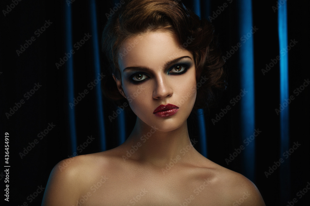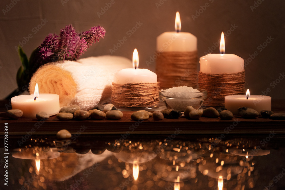 Spa decorative set with sea pebbles, salt, aromatic candles, towel and flower. Golden composition in low key, dark photo with beautiful reflections and bokeh.
