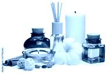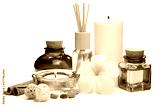 Beautiful spa composition with candles, frangipani flower, oil flasks and other decor elements.