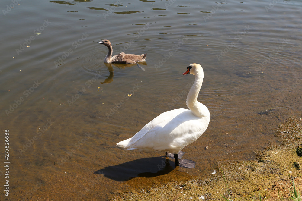 White swan with cub on the river
