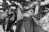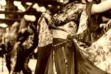 Gypsy dance festival, Woman performing romany dance and folk songs in national clothing. Beautiful roma gypsy girls dancing in traditional floral dress at wedding reception in restaurant