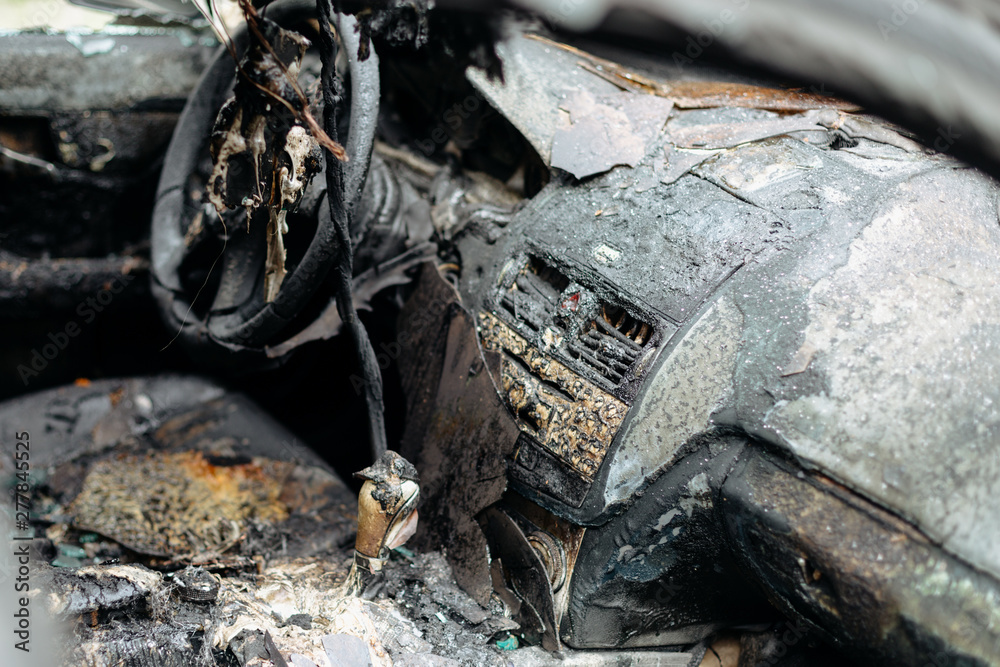 Burnt out car in city street, Riga, Latvia