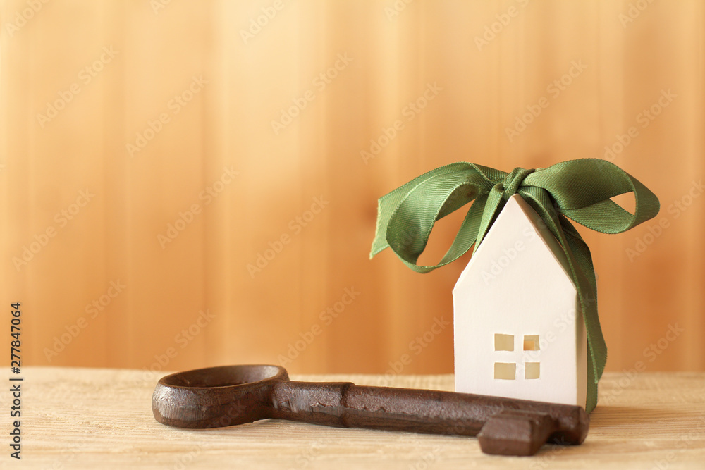 model of the house with a green bow and a big key on a wooden background. holiday property offer