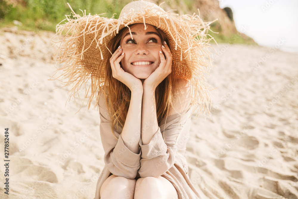 Pleased gorgeous attractive woman posing outdoors at the sea beach.