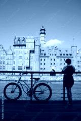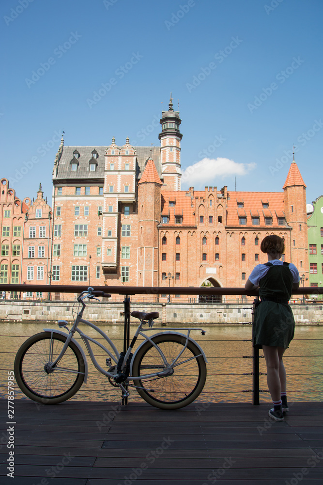 Young woman traveler with retro bicycle stand near river in old gdansk city