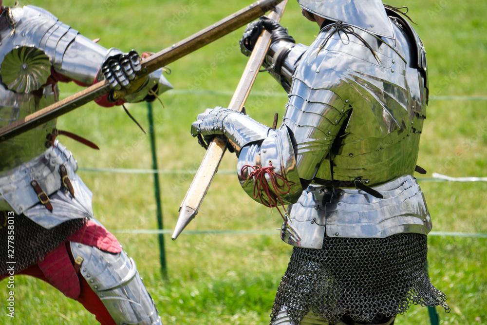 Two medieval knights in armour battle with weapons
