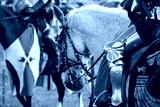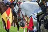 A medieval knight sitting on a horse wearing shining armour