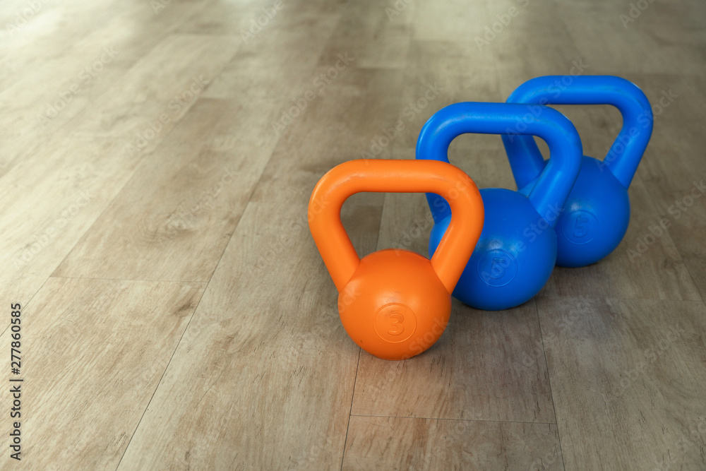 three orange and blue three kilogram kettle-bell weight lifting for exercise on wood floor background