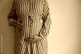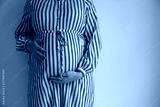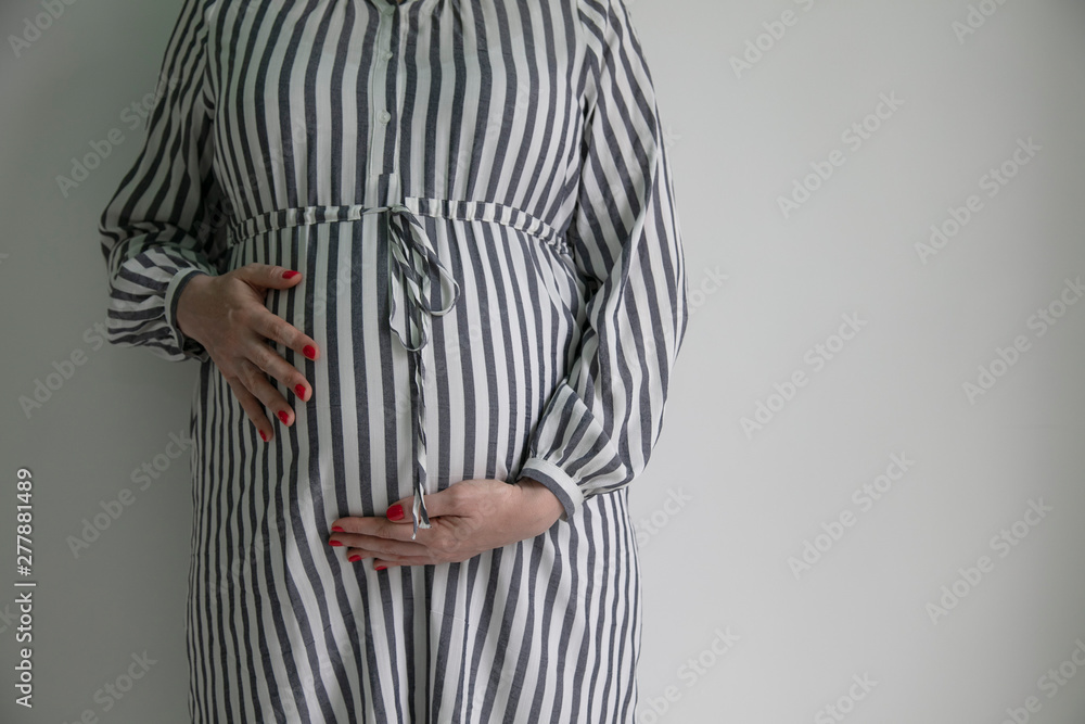 A pregnant woman holding her baby bump stood against a plain background