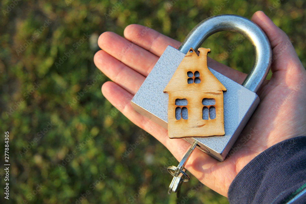 large padlock with keys and a small wooden house in hand. turnkey solution for living