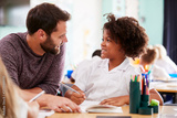 Male Elementary School Teacher Giving Female Pupil Wearing Uniform One To One Support In Classroom
