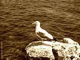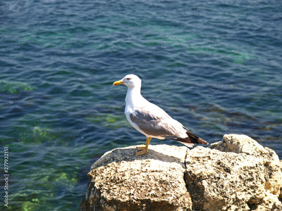 Sevastopol, Crimea - July 19, 2008: Seagull is sitting on the stone sea shore on the sea background in Sevastopol bay. The peninsula of Crimea and it’s picturesque rocky shore