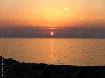Sevastopol, Crimea - July 19, 2008: The peninsula of Crimea and Black sea. Scarlet sunset with ships in the sea. The sun is sitting down the sea line in the area of Sevastopol bay. Picturesque Crimean