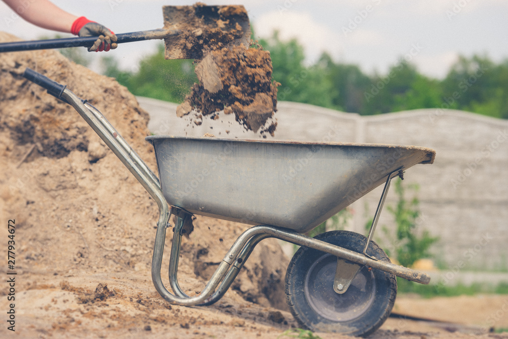 Digging with a shovel. Throwing the soil into a wheelbarrow