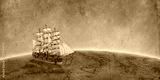 Sailing ship on old world map. Concept of a search for treasure and new discoveries. Copy space beside.