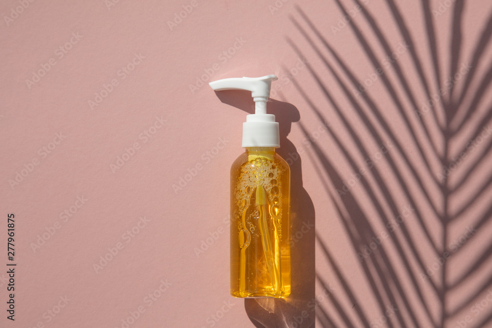 Natural cosmetic oil in a clear bottle with tropical leaf and shadow