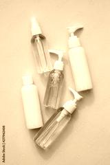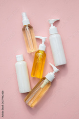 A collection of beauty cosmetic producs in clear bottles on a pink background