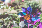 Child's toy windmill in garden or yard, colourful toy in a home garden flower bed
