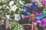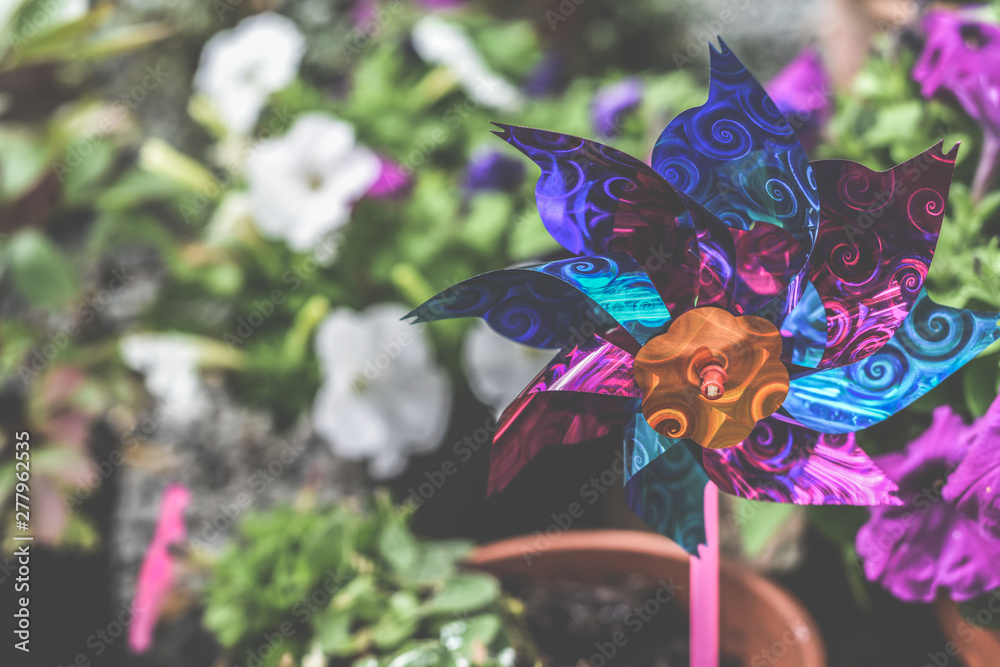 Child's toy windmill in garden or yard, colourful toy in a home garden flower bed