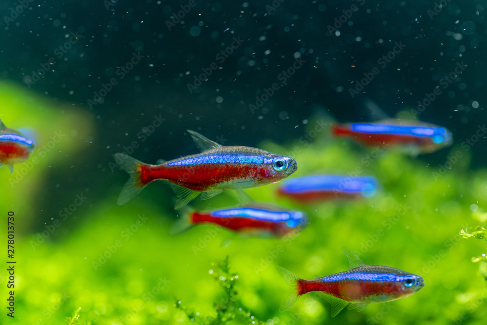 Cardinal tetra (Paracheirodon axelrodi) the most popular ornamental fish for aquatic plants tank. close up photo