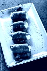 Rolls of baked pepper stuffed with cheese and sour cream on dark stone background. Vegetarian food, clean eating, top view, flat lay