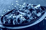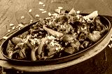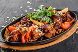 Baked meat with grilled vegetables, greens and almond in pan on black stone background. Hot Meat Dishes