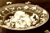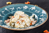 Farfalle pasta in a creamy cheese sauce in plate on dark stone background. Top view, Flat lay. Vegetarian food