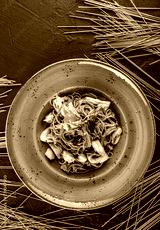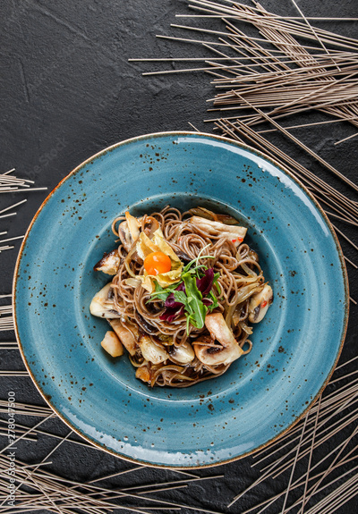 Soba noodles with wild mushrooms in sweet and sour sauce, onions and greens in plate on dark stone background. Top view