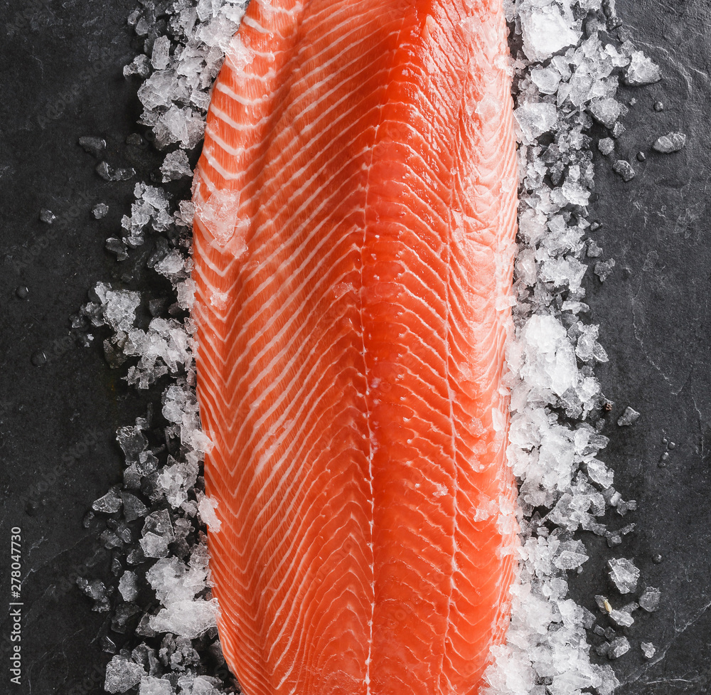 Fresh raw salmon fish steak with spices on ice over dark stone background. Creative layout made of fish, top view, flat lay